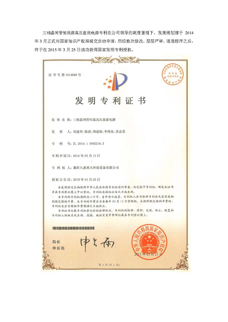 "三相晶闸管恒流高压直流电源"获得国家发明专利授权